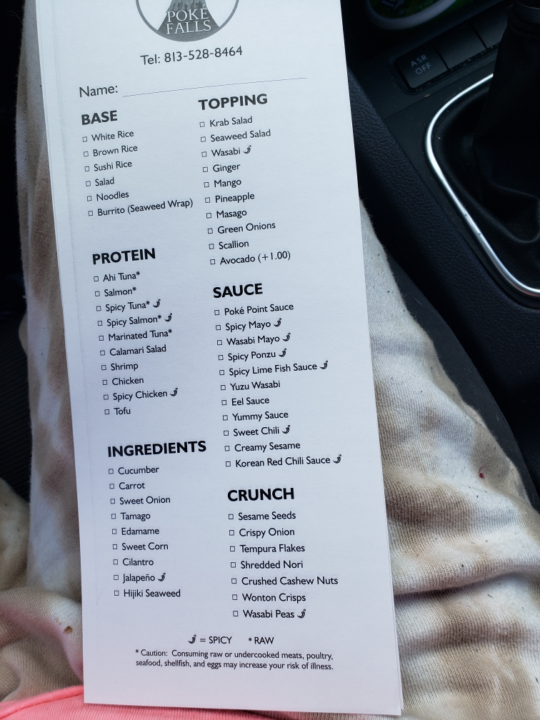 Welcome to Poké Falls, your new haven for fresh and customizable poke bowls in Wesley Chapel, FL! Nestled at 3747 Bruce B Downs Blvd, this vibrant spot proudly showcases a menu filled with high-quality proteins like Ahi Tuna, Salmon, and Spicy Salmon. Each dish is a canvas, allowing you to select from a wide variety of crisp vegetables such as Cucumber and Edamame, alongside tantalizing sauces like Spicy Mayo and Yuzu Wasabi.
